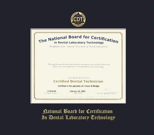 National Board for Certification in Dental Lab Technology Certificate - CDT (2021 to Present) Frame with Black Mat and Gold Embossing