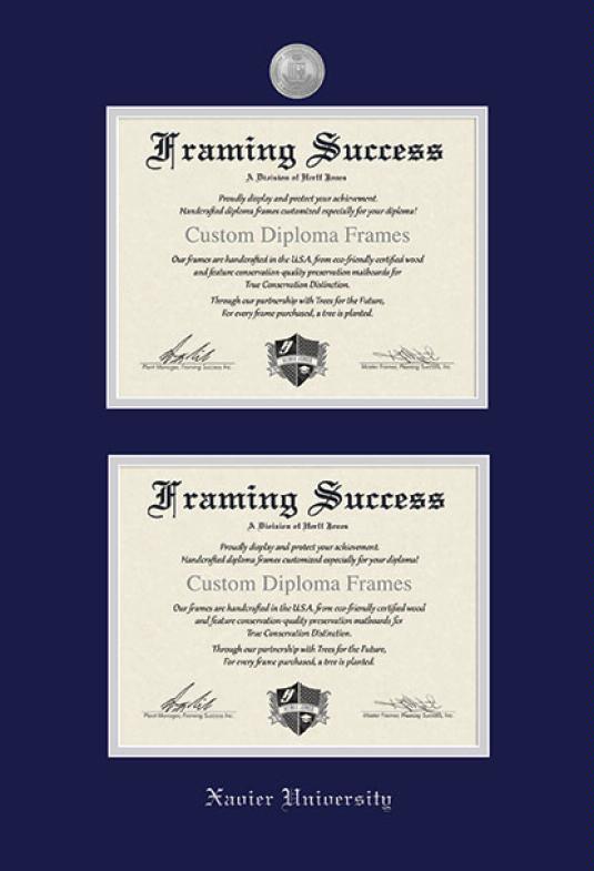 Xavier University Double Diploma - BA/MA (10/21 to Present) Frame with Medallion and Navy Blue and Silver Double Mat and Silver Embossing