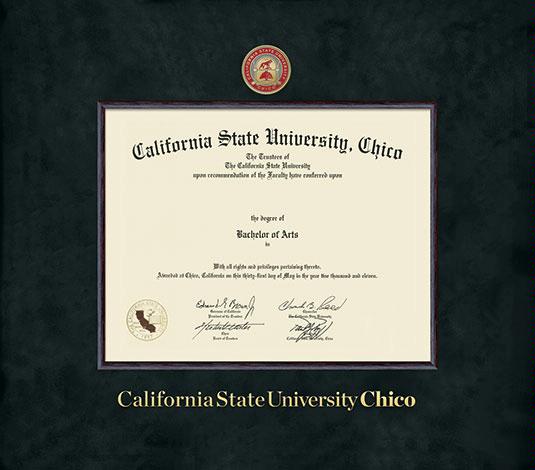 California State University, Chico Diploma (11/21 to Present) Frame with Colored Medallion and Black Suede and Wood Fillet Double Mat and Gold Embossing