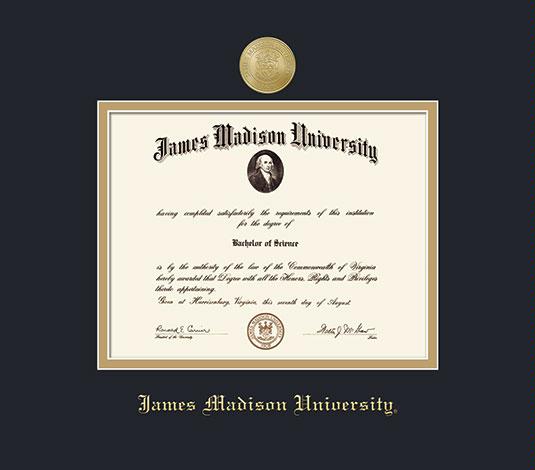 James Madison University Diploma (11/21 to Present) Frame with Medallion and Black and Gold Double Mat and Gold Embossing