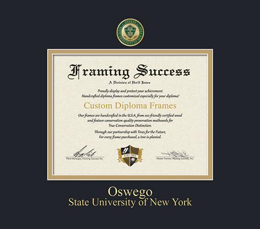 SUNY Oswego Diploma Frame with Colored Medallion and Black and Gold Double Mat and Gold Embossing