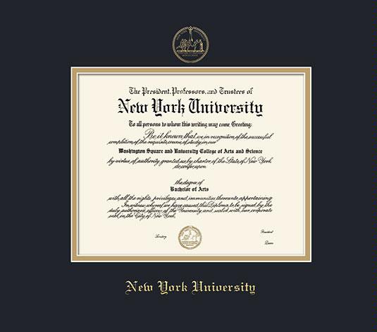 New York University Diploma (4/22 to Present) Frame with Black and Gold Double Mat and Gold Embossing