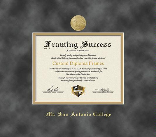 Mt. San Antonio College Diploma Frame with Medallion and Grey Suede and Gold Double Mat and Gold Embossing