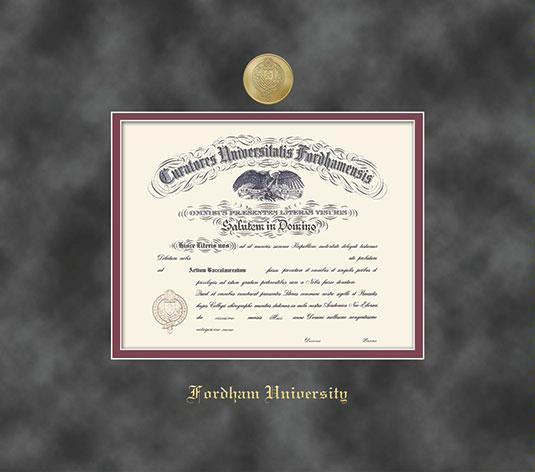 Fordham University Diploma - BA/MA Frame with Medallion and Grey Suede and Maroon Double Mat and Gold Embossing