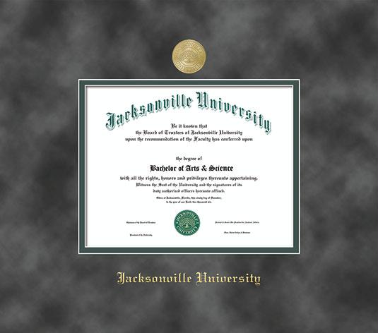 Jacksonville University Diploma (10/18 to Present) Frame with Medallion and Grey Suede and Green Double Mat and Gold Embossing