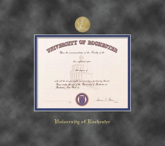 University of Rochester Diploma - PhD Frame with Medallion and Grey Suede and Royal Blue Double Mat and Gold Embossing