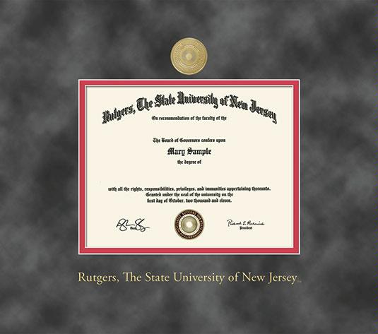 Rutgers University Diploma - MA (7/14 to Present) Frame with Medallion and Grey Suede and Red Double Mat and Gold Embossing