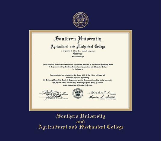 Southern University A&M at Baton Rouge Diploma - BA/MA/PhD/MD Frame with Navy Blue and Gold Double Mat and Gold Embossing
