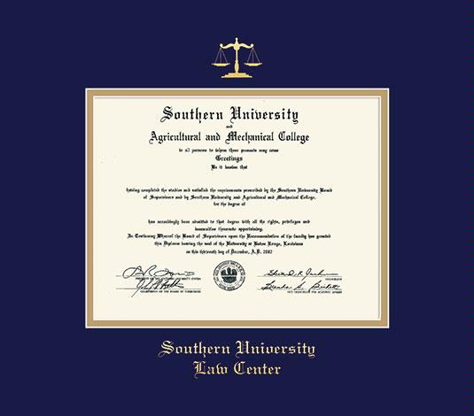 Southern University A&M at Baton Rouge Diploma - Law (5/06 to Present) Frame with Navy Blue and Gold Double Mat and Gold Embossing