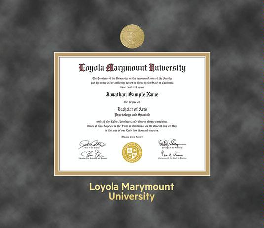 Loyola Marymount University Diploma - EdD (2020 to Present) Frame with Medallion and Grey Suede and Gold Double Mat and Gold Embossing