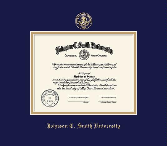 Johnson C. Smith University Diploma Frame with Navy Blue and Gold Double Mat and Gold Embossing