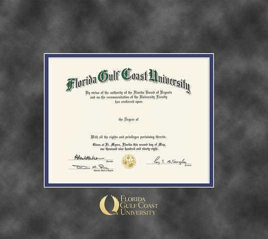 Florida Gulf Coast University Dipoma - BA (1/10 to 5/23) Frame with Grey Suede and Royal Blue Double Mat and Gold Embossing