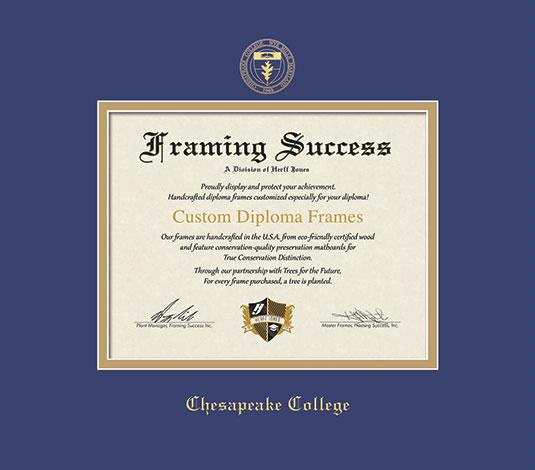 Chesapeake College Diploma Frame with Royal Blue and Gold Double Mat and Gold Embossing
