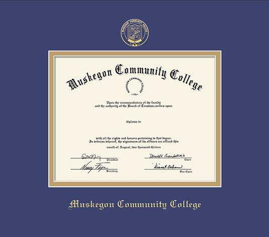 Muskegon Community College Diploma Frame with Royal Blue and Gold Double Mat and Gold Embossing