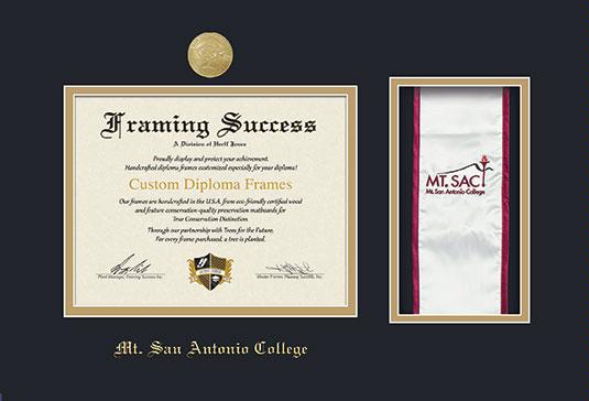 Mt. San Antonio College Diploma Frame with Medallion and Stole Opening and Black and Gold Double Mat and Gold Embossing