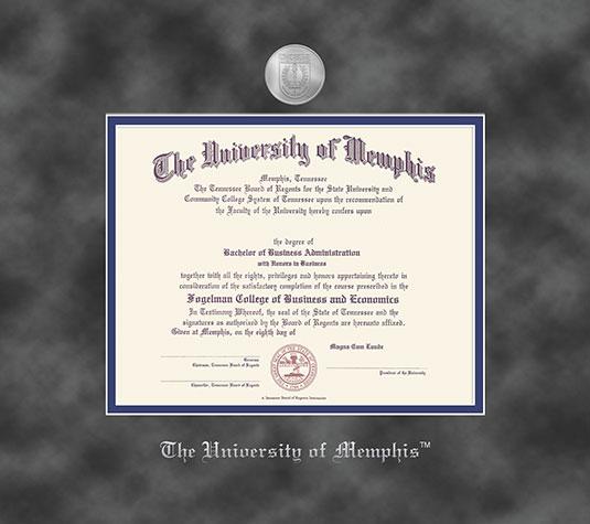 The University of Memphis Diploma - PhD Frame with Medallion and Grey Suede and Royal Blue Double Mat and Silver Embossing