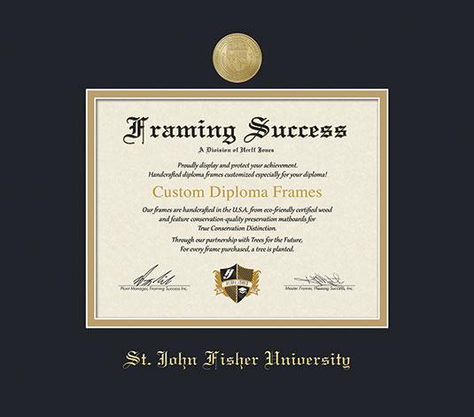 St. John Fisher University Diploma - BA/MA (9/22 to Present) Frame with Medallion and Black and Gold Double Mat and Gold Embossing