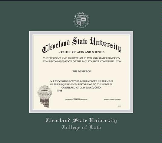 Cleveland State University Diploma - Law (11/22 to Present) Frame with Green and Silver Double Mat and Silver Embossing