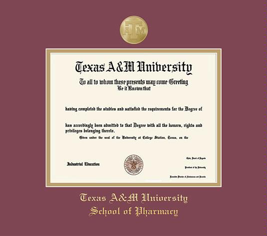 Texas A & M University Diploma - Pharmacy (Pre 11/24) Frame with Medallion and Maroon and Gold Double Mat and Gold Embossing