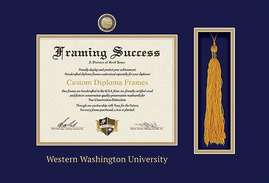 Western Washington University Diploma Frame with Medallion and Tassel Cut-out and Navy Blue and Gold Double Mat and Gold Embossing