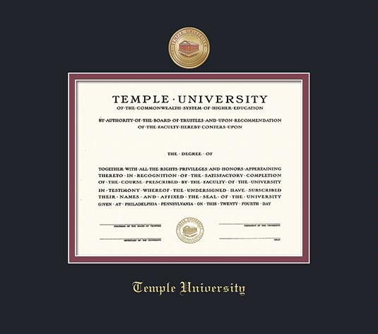 Temple University Diploma-All except Dental (2023 to Present) Frame with Colored Medallion and Black and Maroon Double Mat and Gold Embossing