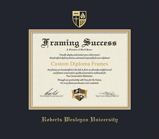 Roberts Wesleyan University Diploma (9/22 to Present) Frame with Black and Gold Double Mat and Gold Embossing