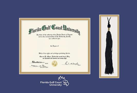Florida Gulf Coast University Diploma - BA (6/23 to Present) Frame with Tassel Cut-out and Royal Blue and Gold Double Mat and White Embossing