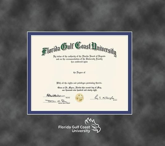 Florida Gulf Coast University Diploma - MA (6/23 to Present) Frame with Grey Suede and Royal Blue Double Mat and White Embossing