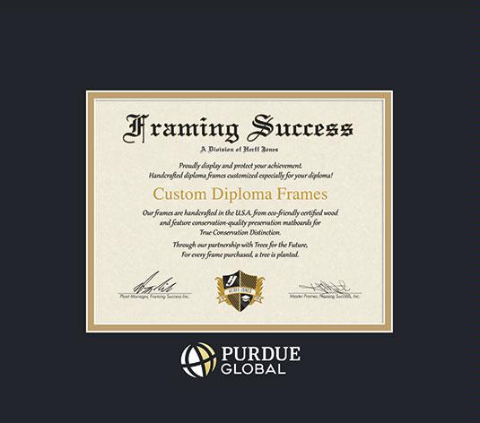 Purdue Global Diploma Frame with Black and Gold Double Mat and 2 Color embossed seal