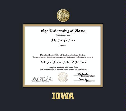 The University of Iowa (Hawk Shop) Diploma - All Frame with Medallion and Black and Gold Double Mat and Gold Embossing