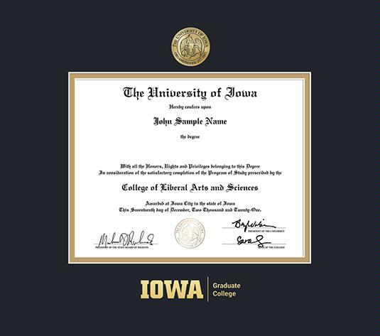 The University of Iowa Diploma - Graduate College Frame with Medallion and Black and Gold Double Mat and Gold Embossing