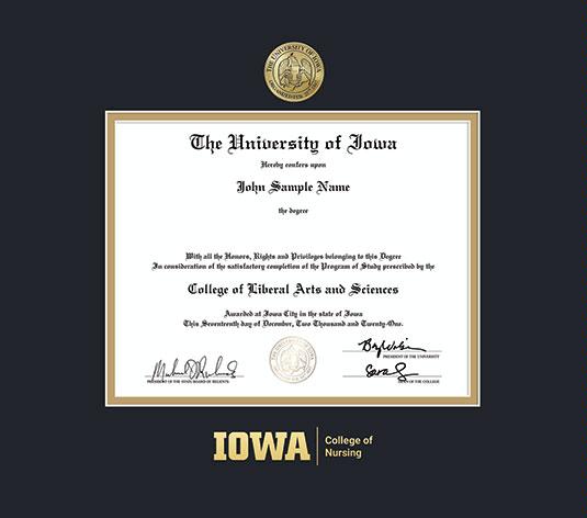 The University of Iowa Diploma - Nursing Frame with Medallion and Black and Gold Double Mat and Gold Embossing
