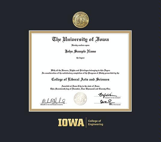 The University of Iowa Diploma - Engineering Frame with Medallion and Black and Gold Double Mat and Gold Embossing