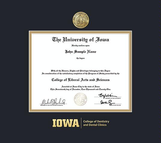 The University of Iowa Diploma - Dental Frame with Medallion and Black and Gold Double Mat and Gold Embossing