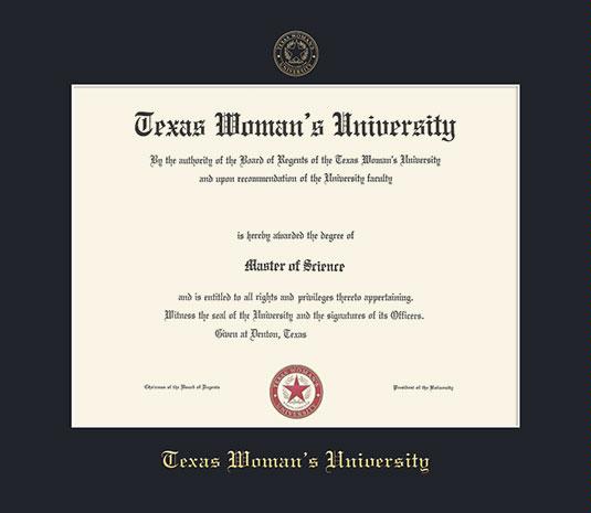 Texas Woman's University Diploma Frame with Dark Black Mat and Gold Embossing