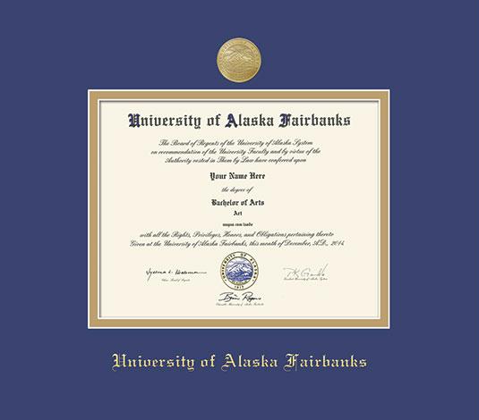 University of Alaska Fairbanks Diploma Frame with Medallion and Royal Blue and Gold Double Mat and Gold Embossing