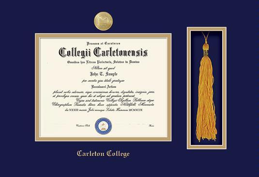 Carleton College Diploma Frame with Medallion and Tassel Cut-out and Navy Blue and Gold Double Mat and Gold Embossing