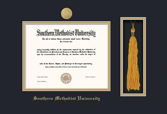 Southern Methodist University Diploma - MA/PhD & (12/25-Pres) BA Frame with Medallion and Tassel Cut-out and Black and Gold Double Mat and Gold Embossing