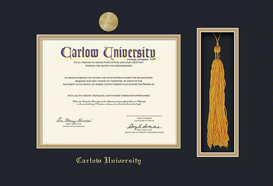 Carlow University Diploma - Doctorate (7/17 to Present) Frame with Medallion and Tassel Cut-out and Black and Gold Double Mat and Gold Embossing