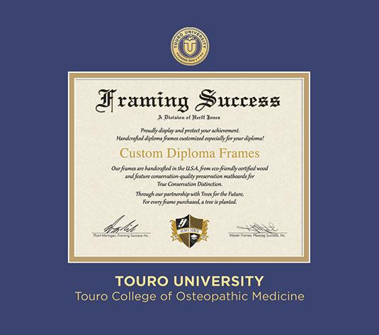 Touro University Touro College of Osteopathic Medicine Diploma Frame with Royal Blue and Gold Double Mat and Gold Embossing