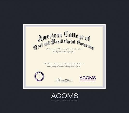 American College of Oral & Maxillofacial Surgeons Certificate (8.5"h x 11"w) Frame with Black and Silver Double Mat and Silver Embossing