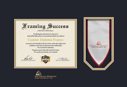 Southeast Missouri State University Diploma and Stole Cut-out Frame with Black and Gold Double Mat and Gold Embossing