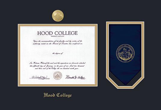 Hood College Diploma Frame with Medallion and Stole Cut-out with Black and Gold Double Mat and Gold Embossing