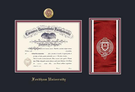 Fordham University Diploma - BA/MA Frame with Colored Medallion and Stole Cut-out and Black and Maroon Double Mat and Gold Embossing