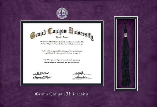 Grand Canyon University Diploma - BA/MA Frame with Colored Medallion and Tassel Cut-out and Purple Suede and Black Double Mat and Silver Embossing