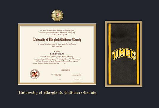 University of Maryland- Baltimore County DIploma (5/19 to Present) Frame with Medallion and Stole Cut-out and Black and Gold Double Mat and Gold Embossing