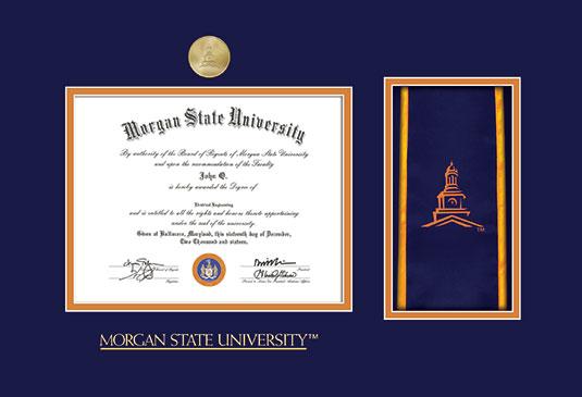 Morgan State University Diploma - BA/MA and Stole Cut-out Frame with Medallion and Navy Blue and Orange Double Mat and Gold Embossing