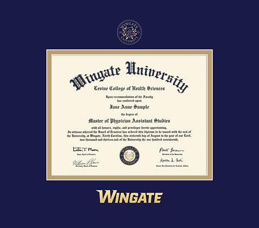 Wingate University Diploma - BA/MA/Doc (9/24 to Present) Frame with Navy Blue and Gold Double Mat and Gold Embossing