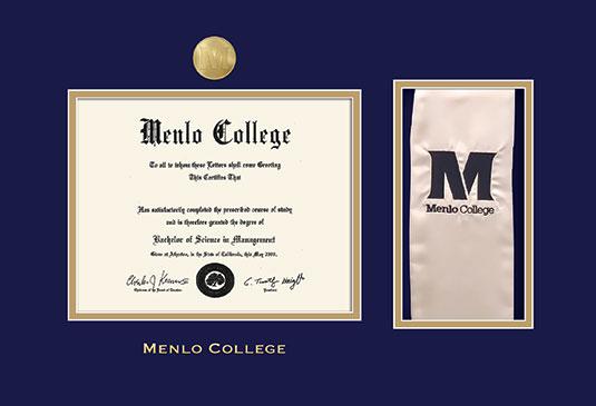 Menlo College Diploma - BA (2018 to Present) and Stole Cut-out Frame with Medallion and Navy Blue and Gold Double Mat and Gold Embossing