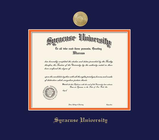 Syracuse University Diploma - Doctorate (2018 to Present) Frame with Medallion and Navy Blue and Burnt Orange Double Mat and Gold Embossing